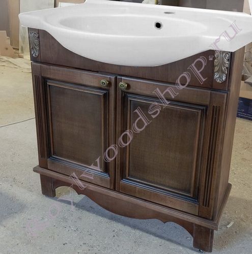 В производстве корпусов, фасадов использованы только природные материалы - массив березы, мебельная фанера. Поверхности тумбочки обработаны влагозащитным составом, покрыты лаком. Спокойный цвет "античный орех" хорошо подходит темным и светлым интерьерам ванных. Золочение рельефного декора акцентирует внимание на фактуре дерева, придает мебели благородную изысканность.